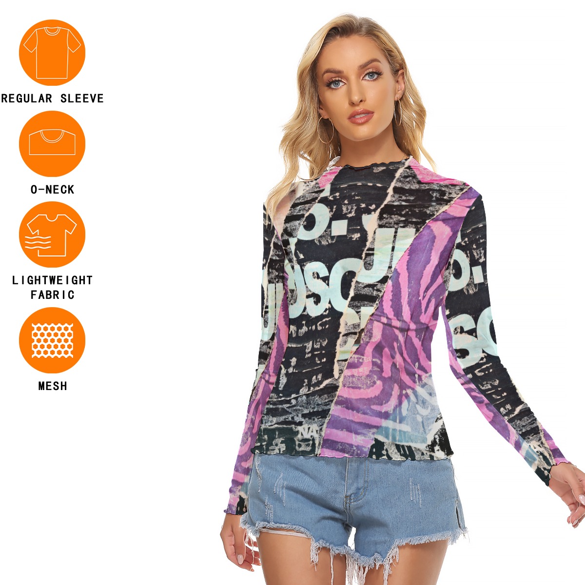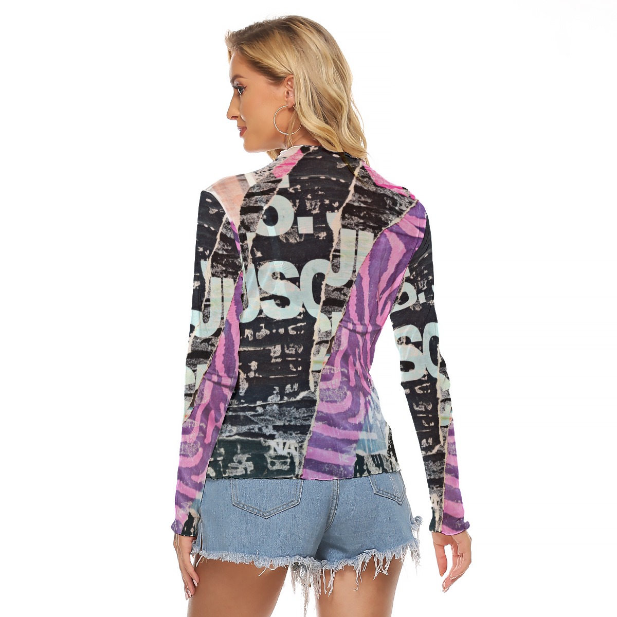 The artistic abstract graphic print brings a modern street-style edge, while the unique tailoring at the neckline and cuffs enhances the silhouette for a more refined and eye-catching look. Sheer yet stylish, this long-sleeve mesh blouse is perfect for layering or wearing solo—day to night.