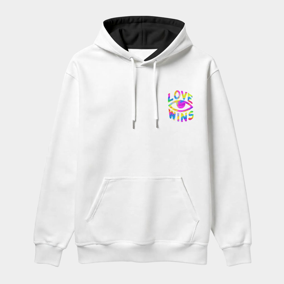 - White drawstring, front kangaroo pocket, and black inner hood